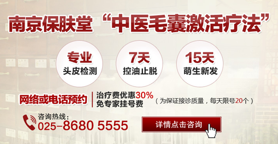 针对脱发的发生与体内皮脂分泌物堵塞毛囊、环境因素、遗传因素等有关,南京肤康皮肤中医门诊部在传承中医千年精髓的基础上,汲取国外前沿科技成果,精选十几种名贵中药,研制出治疗脱发的特效方法--“中医毛囊激活疗法”,该方法十分有效地激活刺激造血系统,快速刺激毛囊细胞生长,特别是激活了BMP(生发细胞酶),刺激新发的产生,突破了传统方法治标不治本的不足,从根论治,进而实现治疗脱发。经临床验证,中医毛囊激活疗法已成功恢复了数众多患者,且无再发作现象,恢复率高达98.6%。